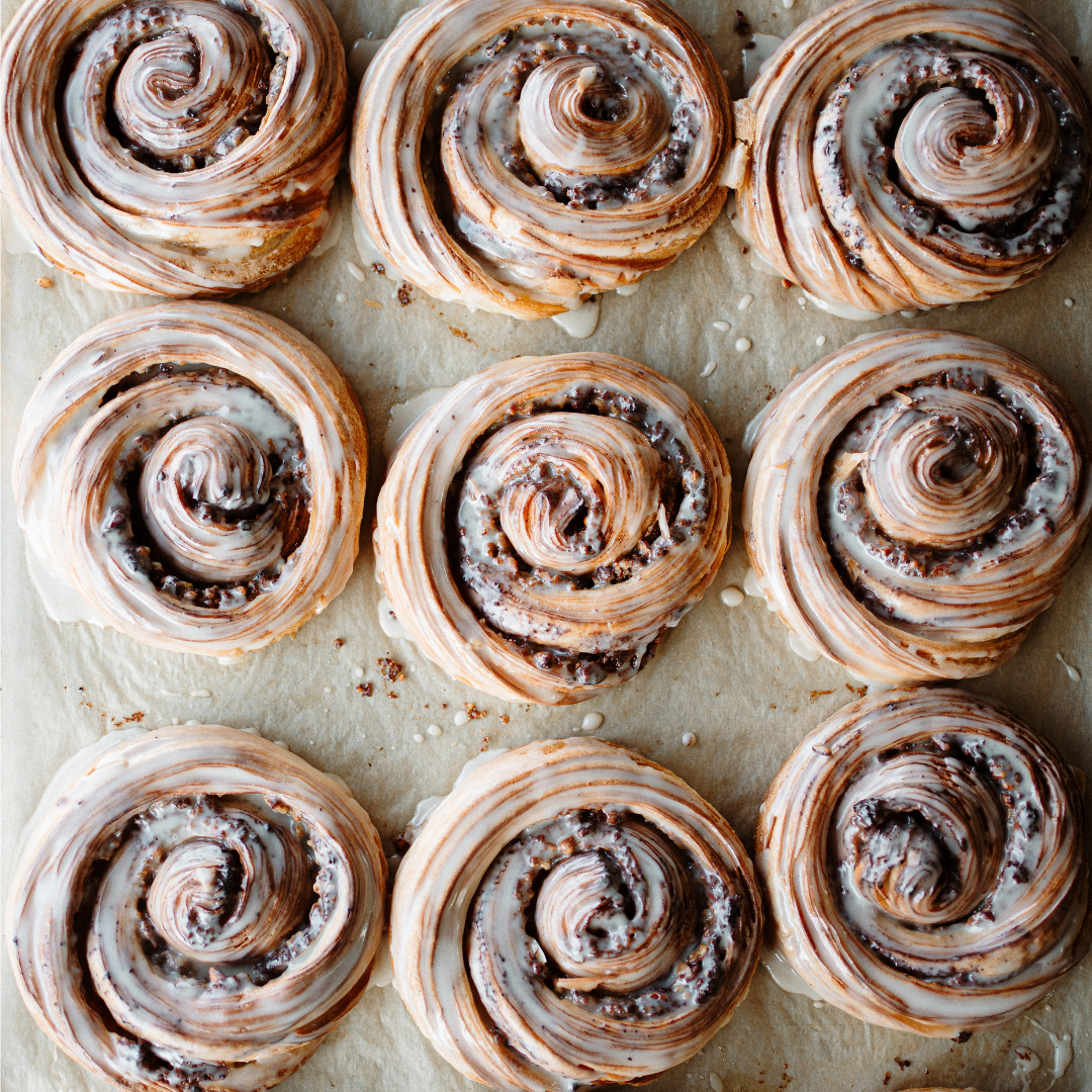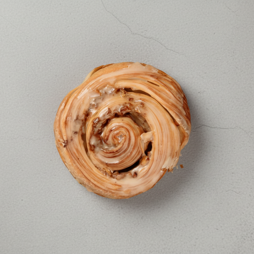 All butter Danish dough made with Wildfarmed flour and Estate dairy butter, with a pecan maple praline, finished with a maple icing glaze